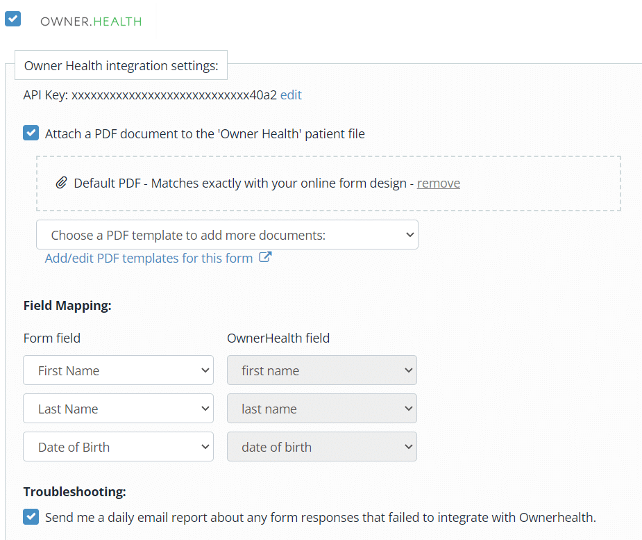 6. Select the checkbox and enter your email to receive a daily email report of any form responses that have failed to sync with Owner Health.