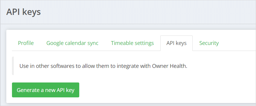 For the configuration settings, you will need to generate a new API key in your Owner Health account. To get this key, please log into your Owner Health account and go to Profile & Settings > API Keys > Generate a new API key.